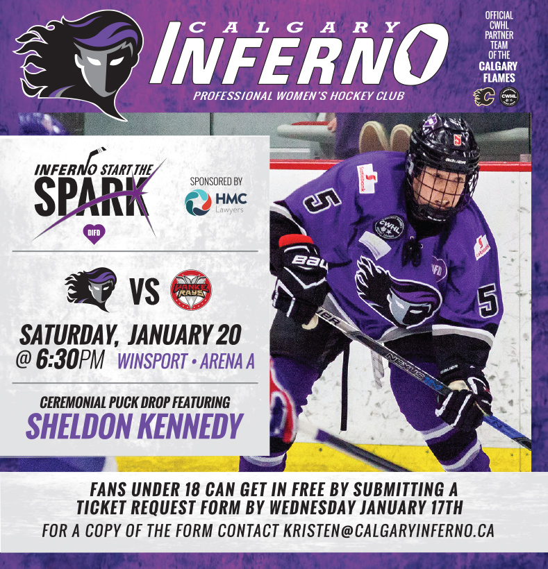 Join the CWHl Calgary Inferno on January 20, for their Start the Spark Game raising awareness for Mental Health. Fans under 18 can get in FREE by submitting a ticket request form to kristen@calgaryinferno.ca