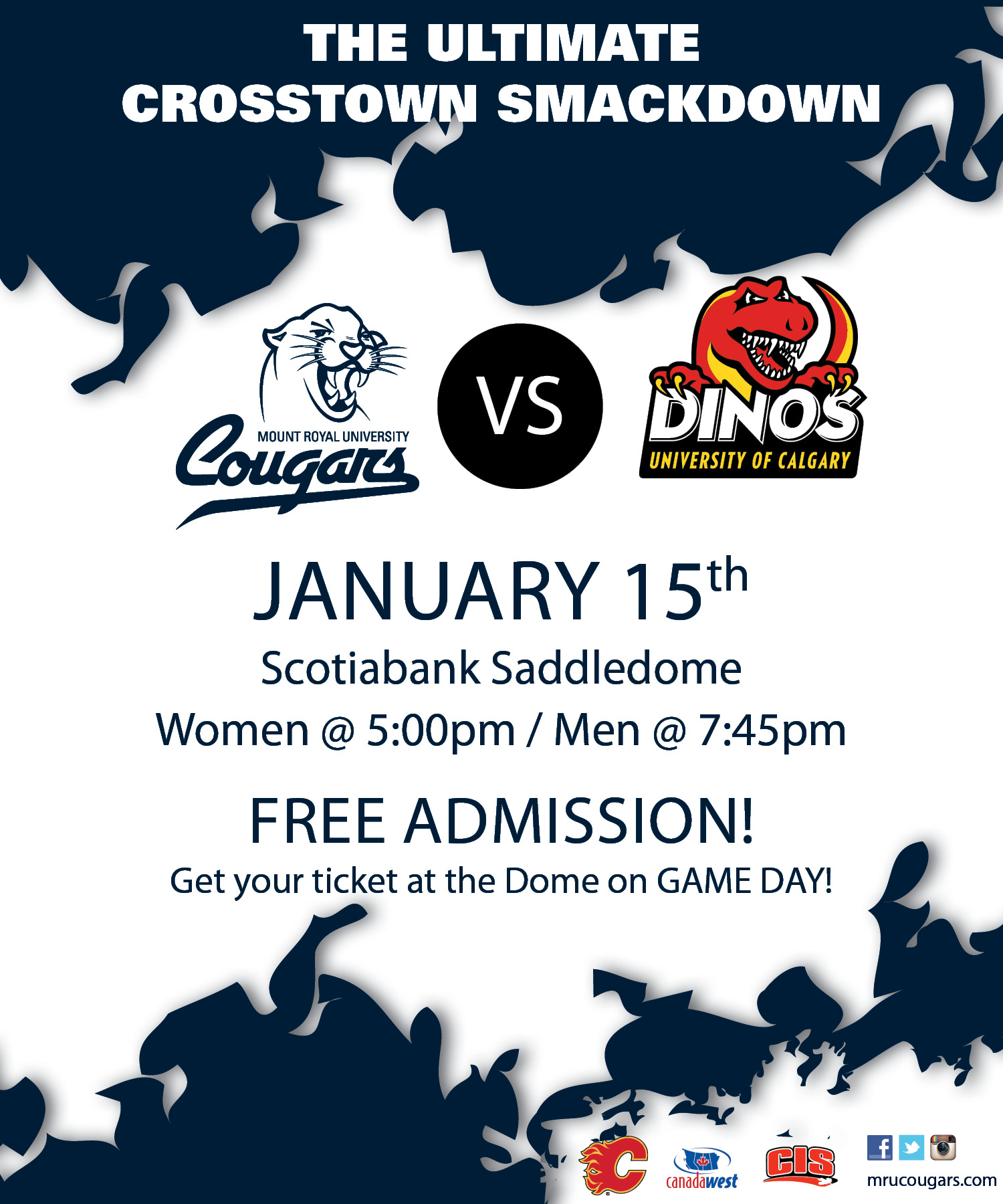 The MRU Cougars are facing off against the UofC Dinos in their annual Crowchild Classic on Thursday, Jan. 15 at the Saddledome! Tickets are FREE! Wear your BLUE or RED and support your favourite University team!