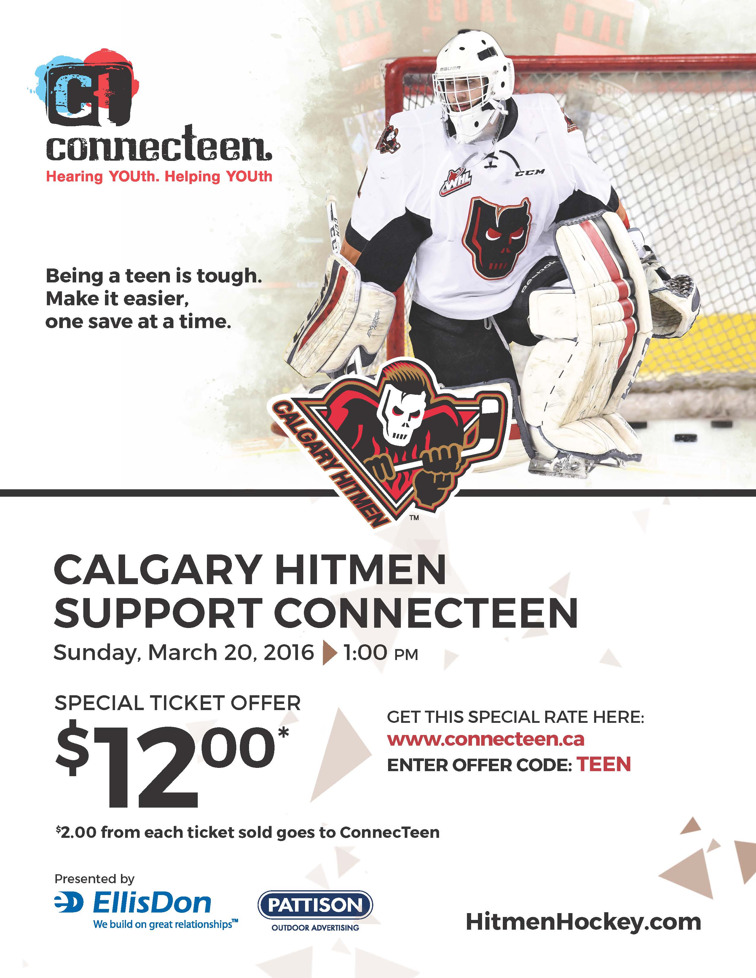 For six years now, the Calgary Hitmen have been raising awareness for ConnecTeen peer counselling services and saving the lives of youth in Calgary. A percentage of ticket sales purchased through promo code: TEEN are donated to ConnecTeen and ConnecTeen also receives half of the 50/50 winnings from their game!