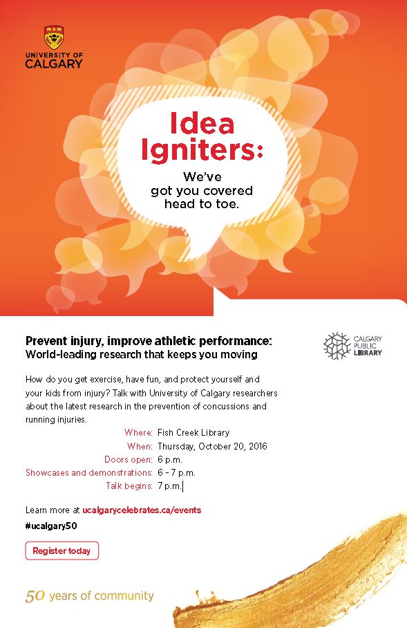 How do you get exercise, have fun, and protect yourself and your kids from injury? Learn about the latest research in the prevention of concussions and running injuries from University of Calgary researchers in an evening of learning, idea-generation and discussion. We’ve got you covered head to toe! http://ow.ly/Axq4304YpcJ